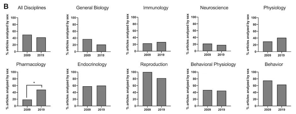 The authors also examined the percentage of publications reporting sex-based analyses and found that this measure decreased from 50% overall in 2009 to 42% in 2019 (Figure 2). While improvements in overall sex inclusion are promising, meaningful analysis of sex as a biological variable is critical for contextualizing results and enhancing reproducibility in biological research. When we default to collapsing data across sex, we risk increasing variability and losing valuable information that could lead to development of novel therapeutics and improve health for men and women.