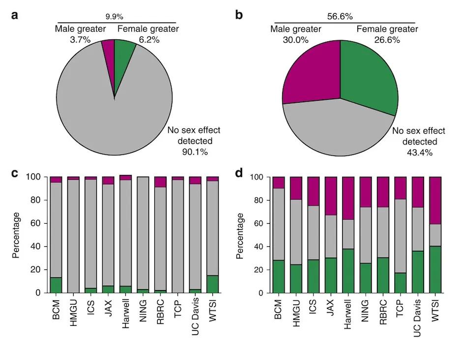Sex differences are prevalent across biological disciplines. In one collaborative study, researchers from The Jackson Laboratory and 9 other institutions used high-throughput phenotype data from more than 14,000 wildtype and 40,000 mutant mice (including 2,186 knockout lines) to estimate the proportion of phenotypes that show some degree of sexual dimorphism. The datasets included 234 different phenotypic traits overall, quantified either categorically or continuously. For categorical measures, there is little room for nuance and few sex effects were observed. But over 50% of continuously measured phenotypes showed some degree of sexual dimorphism (Karp et al. 2017).