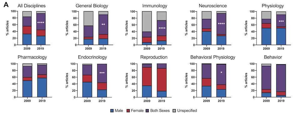 Figure 1: Percentage of surveyed publications reporting inclusion of only males, only females, both sexes, or sex not reported, across nine different biological disciplines. From 2009 to 2019, overall sex inclusion increased from 28% to 49%.